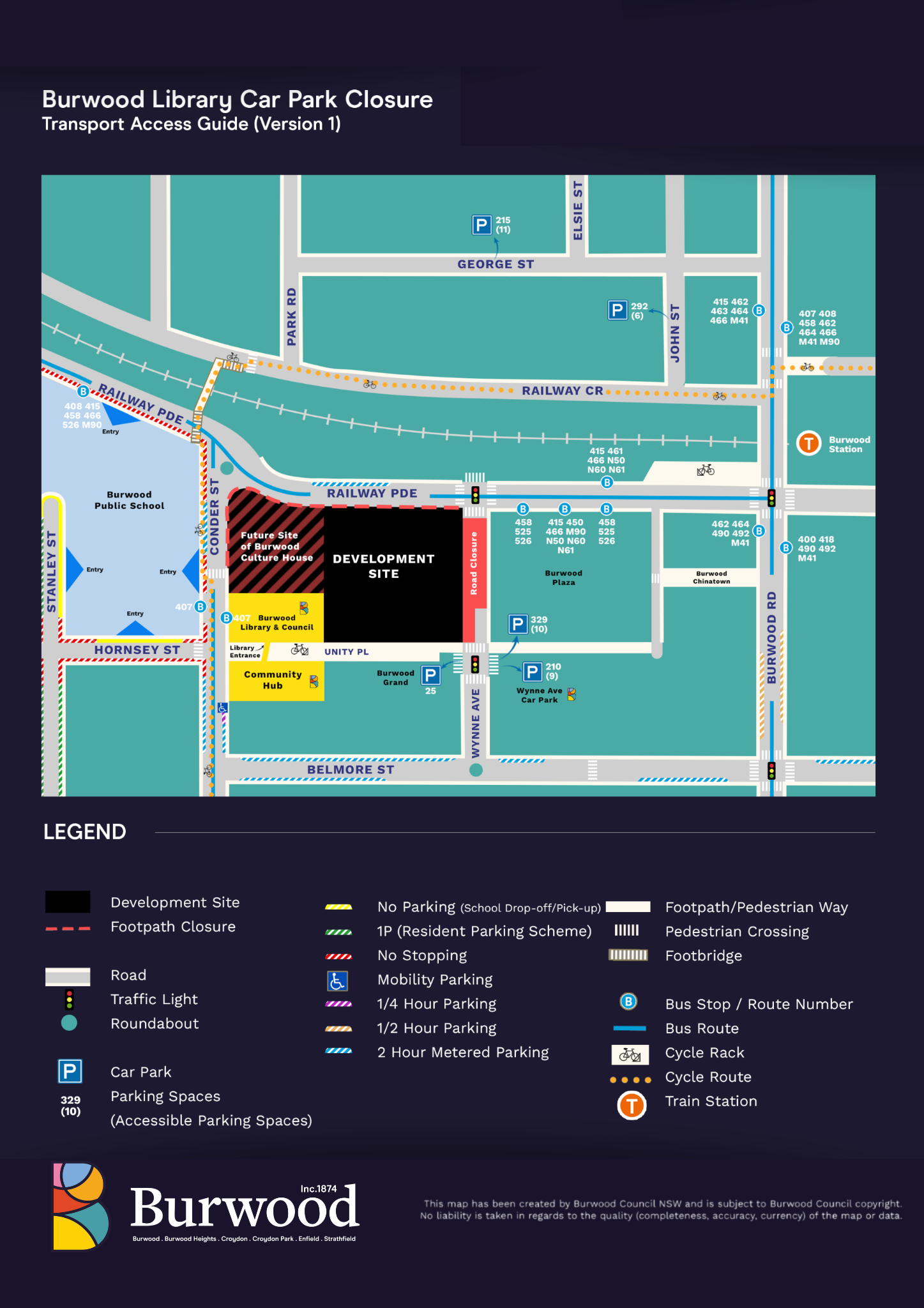 With the closure of the outdoor Library car park, Council will make adjustments to the close-by street parking, taking into account Disabled Parking spots, Loading Zones and the requirements of pick-up and drop-offs for Burwood Public School. If you are a member of the Burwood Public School community, please click here for a Transport Access Guide specifically for you.