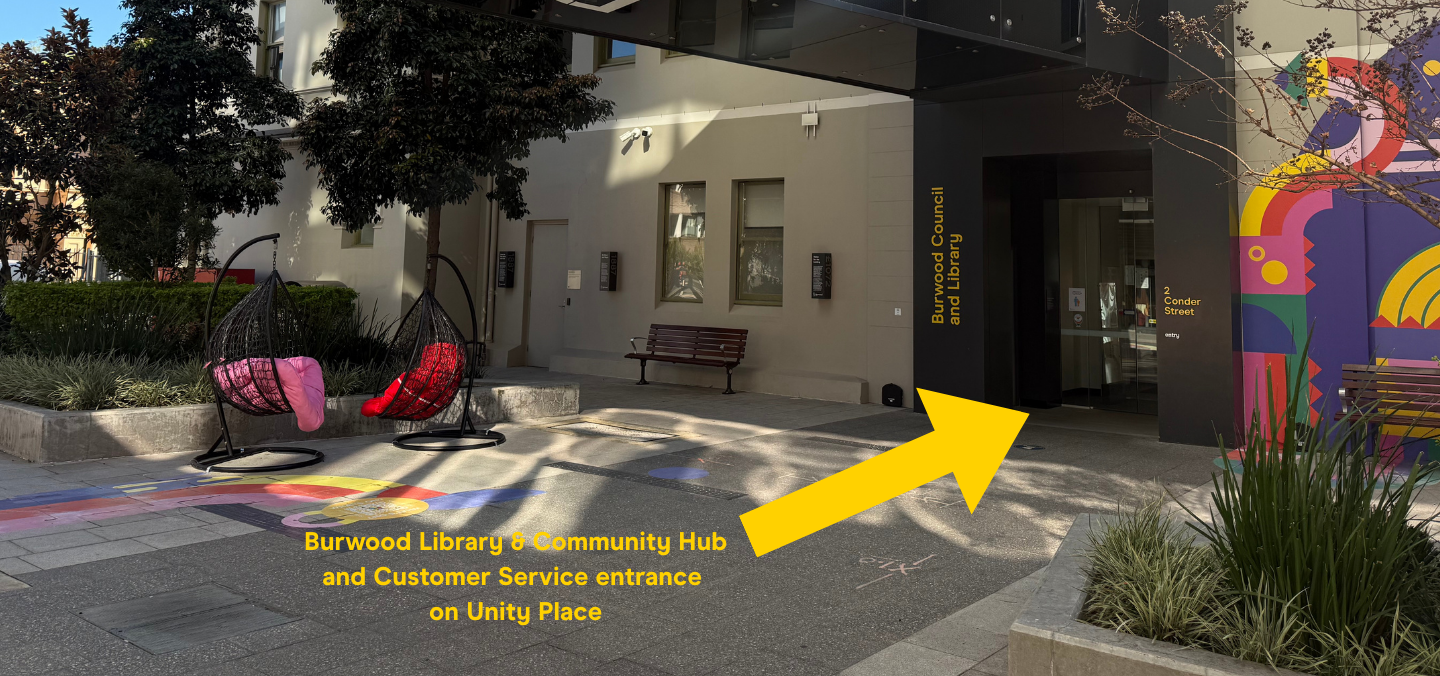 Burwood Library & Community Hub will remain open throughout the Burwood Culture House construction period and entry will be via Unity Place.